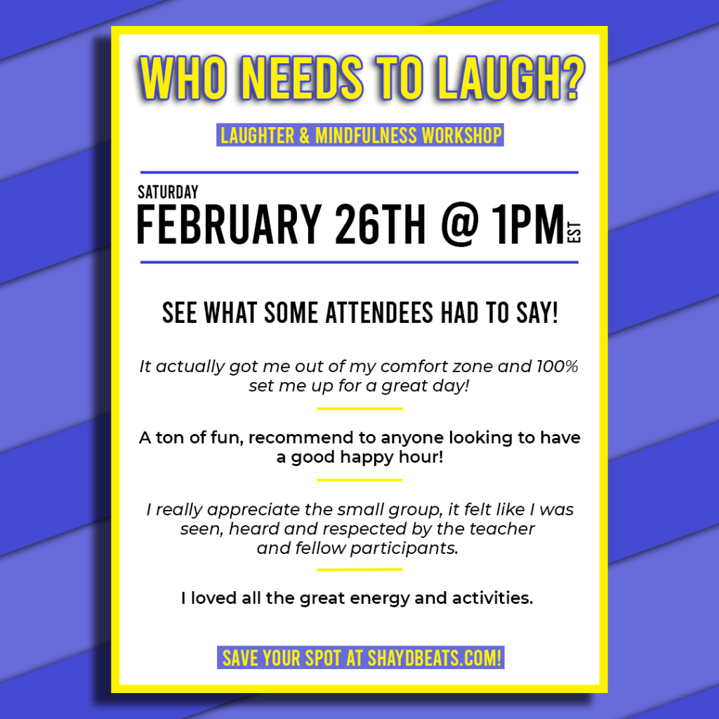 Join me in a laughter and mindfulness online workshop this Saturday, February 26th at 1pm EST! Future dates available as well! Save your spot today!